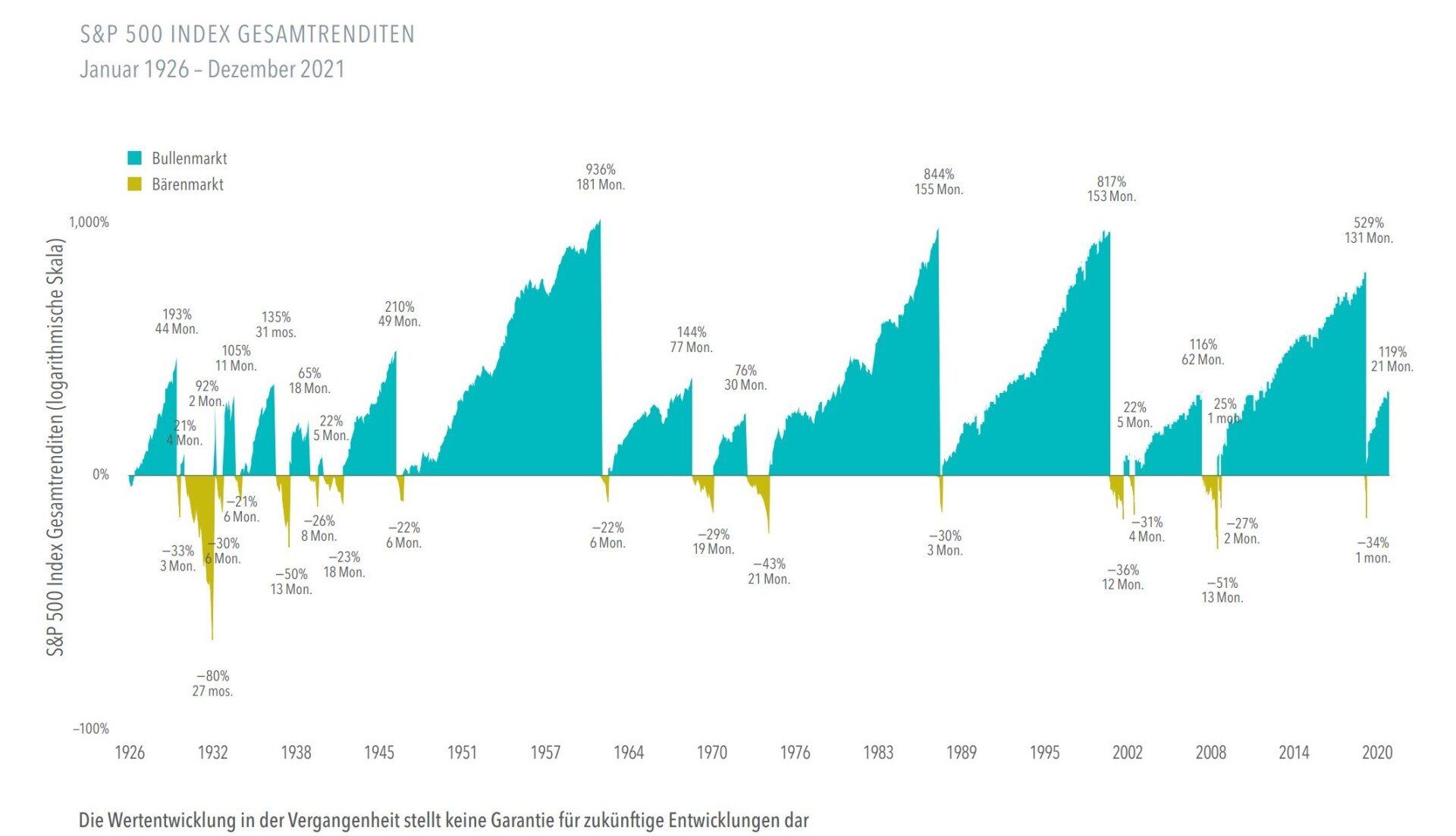 Von 1926 bis zum 2021 verzeichnete der S&P 500 Index 17 Bärenmärkte, also einen Rückgang von mindestens 20% gegenüber einem früheren Höchststand. Die Rückgänge reichten von –21% bis –80% über eine durchschnittliche Dauer von etwa 10 Monaten. Auf der positiven Seite gab es 18 Bullenmärkte, also Gewinne von mindestens 20% von einem vorherigen Tief. Sie waren durchschnittlich 55 Monate lang und die Anstiege betrugen zwischen 21% und 936%.